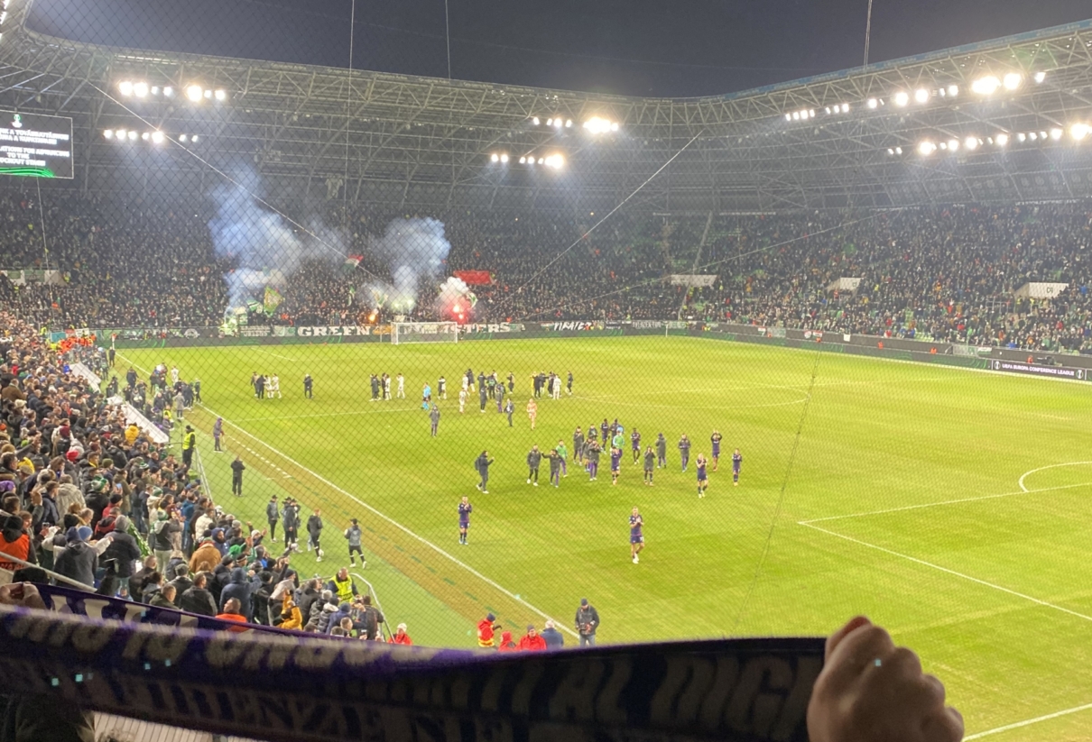 Quindi, dopo aver dormito sì e no 1 ora durante la notte, prendiamo il volo (in orario) e atterriamo a Budapest. Il tempo di posare le cose in hotel ed è già subito clima partita: pranzo al volo, metro fino al punto di ritrovo e viaggio (interminabile) verso lo stadio. In quest’ultimo, stranamente, nessuna scorta vera e propria, nessuna strada libera; tutti imbottigliati nel traffico. Dopo un bel po’, arrivati nello spiazzo in cui distribuivano i biglietti, è successa l’apoteosi durante il pre filtraggio, con gli steward che hanno trattato me e tantissimi altri tifosi viola come animali.